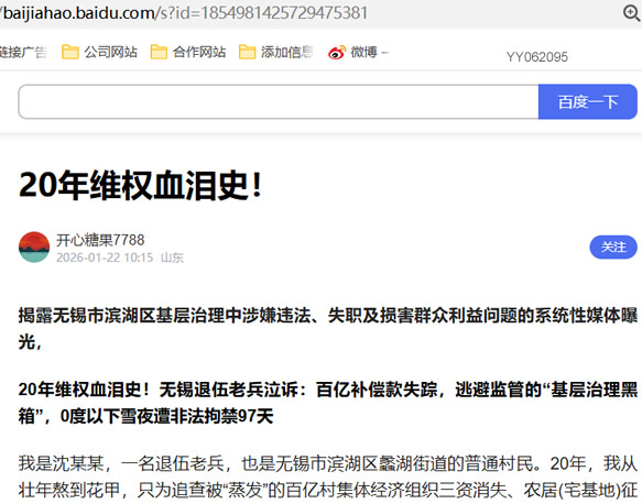 20年维权血泪史!无锡退伍老兵泣诉:百亿补偿款失踪,逃避监管的“基层治理黑箱”,0度以下雪夜遭非法拘禁97天